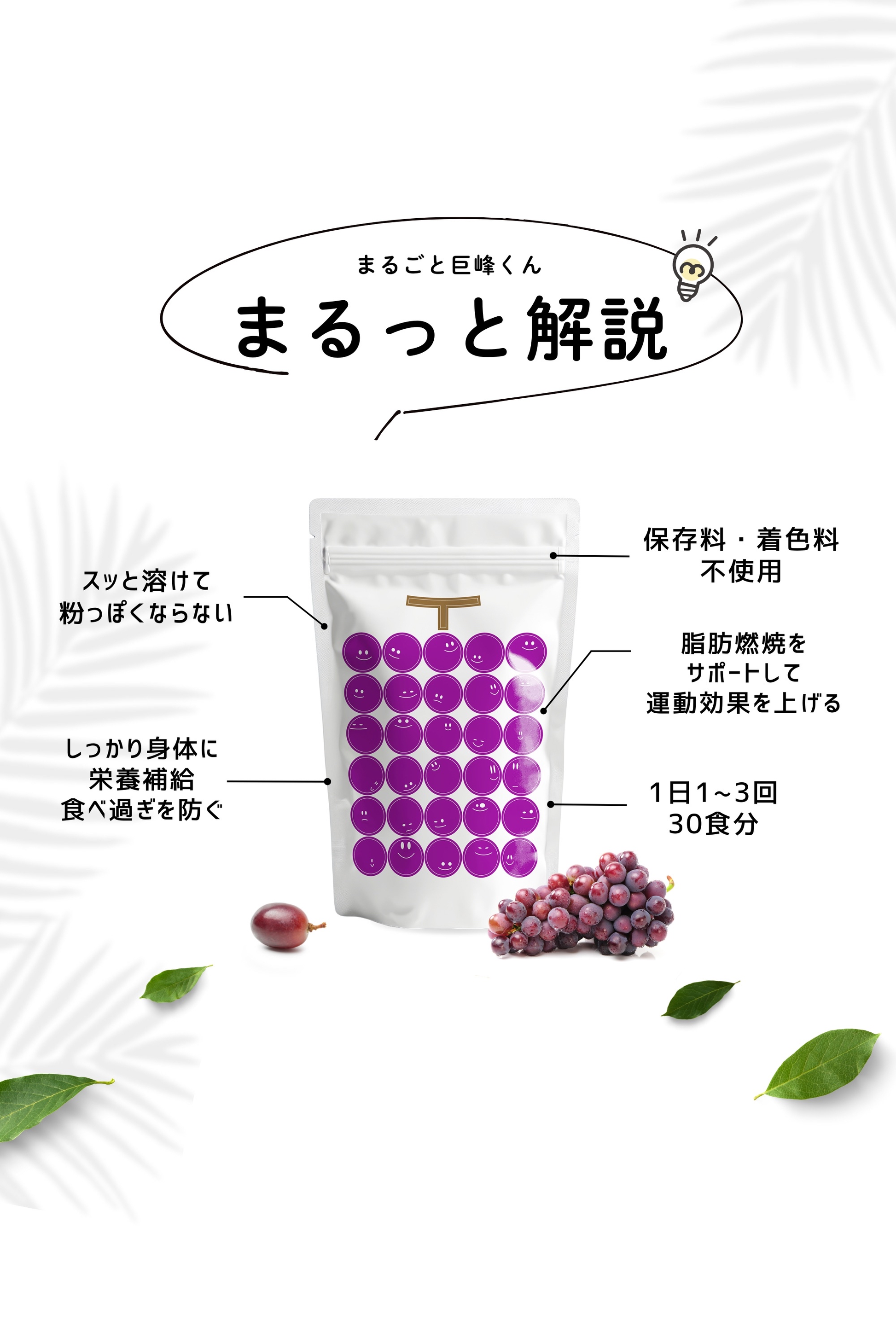 - 🍇「まるごと巨峰くん」は、着色料や保存料を使わないEAAにすることでみなさんが日々安心してご愛飲いただけるように1つ1つ丁寧に日本国内で生産しており、甘さを控えめに調整し飽きずに毎日おいしく飲みやすいEAAにしています。